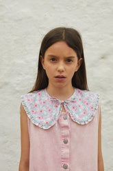 Zawsze inspirowane romantycznym światem marzeń. Piękny kołnierz Lilian z delikatnie marszczonymi detalami dookoła, jasnoniebieska lamówka idealnie pasująca do kwitnącego kwiatowego wzoru. Zapięcie na wstążkę z przodu. Jeden rozmiar pasuje do wszystkich!