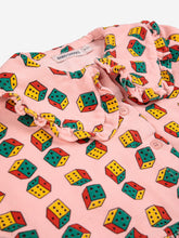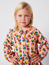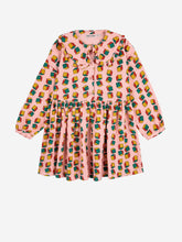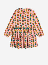 Różowa sukienka. Posiada płaski kołnierzyk, długie rękawy, zapięcie na guziki z przodu, mankiety zapinane na guziki, marszczenia, krój evasé, długość do kolan, sztruks, falbany i pół plisy. Wyprodukowano w Hiszpanii.