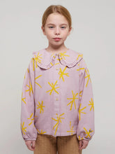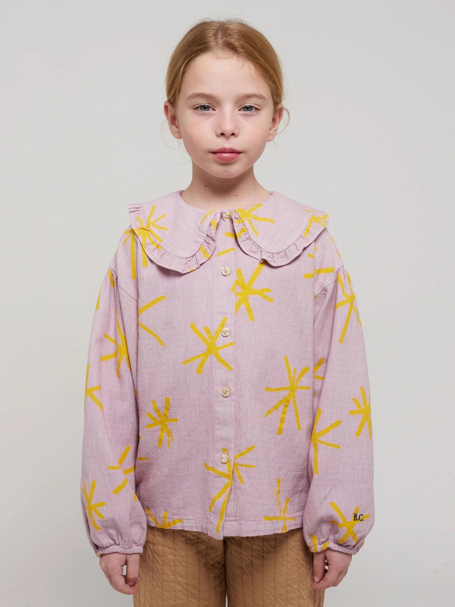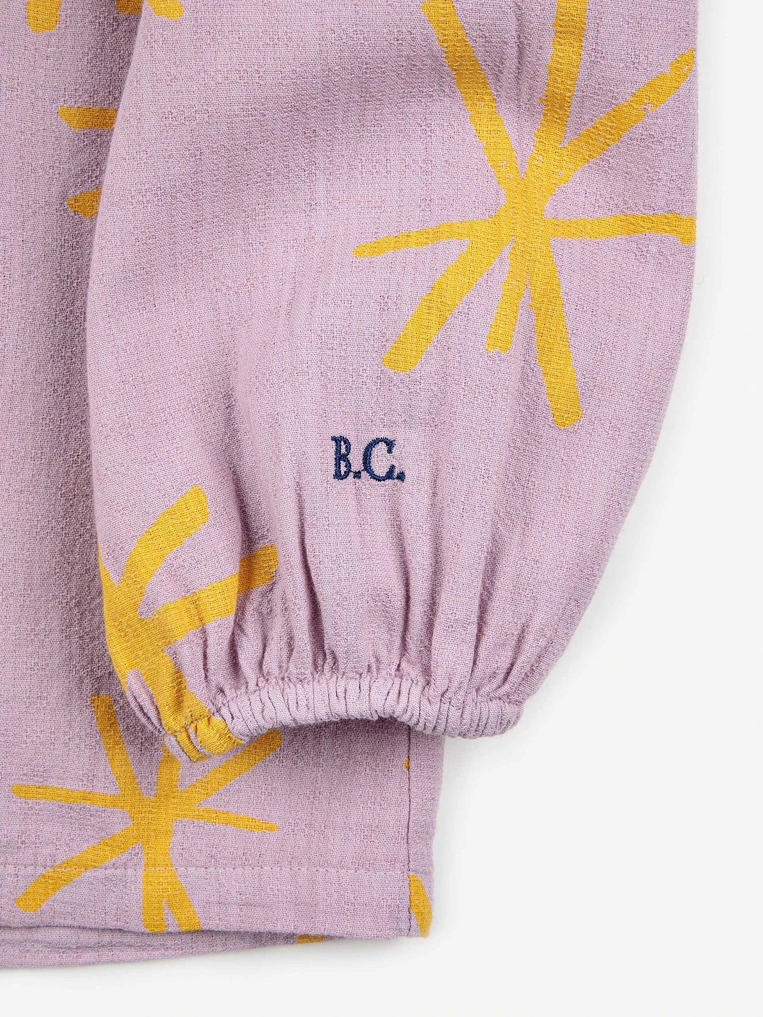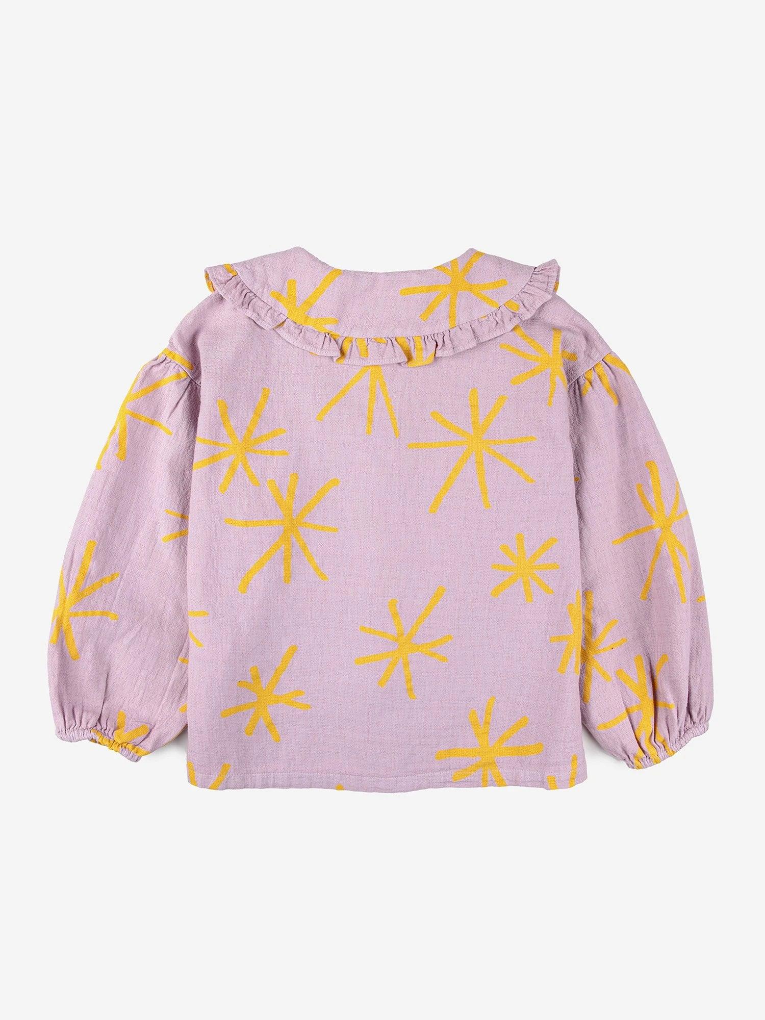 Koszula z długim rękawem, w kolorze lawendowym, wykonana w 100% z bawełny. Model z kołnierzykiem typu Piotruś Pan, długimi rękawami, zapięciem na guziki z przodu, plisowanymi, elastycznymi mankietami i marszczeniem. Ma luźny krój. Wyprodukowano w Hiszpanii.