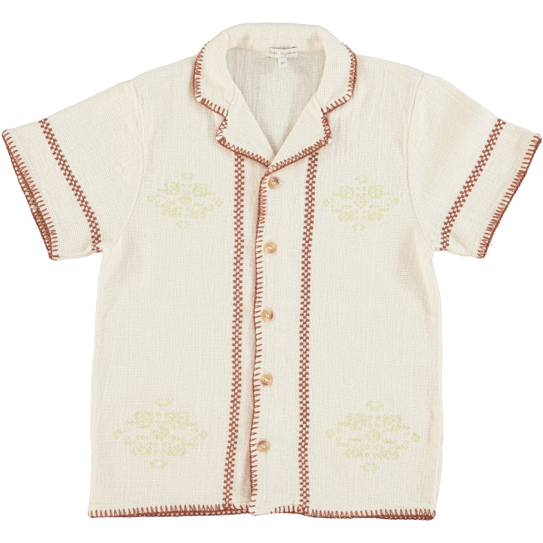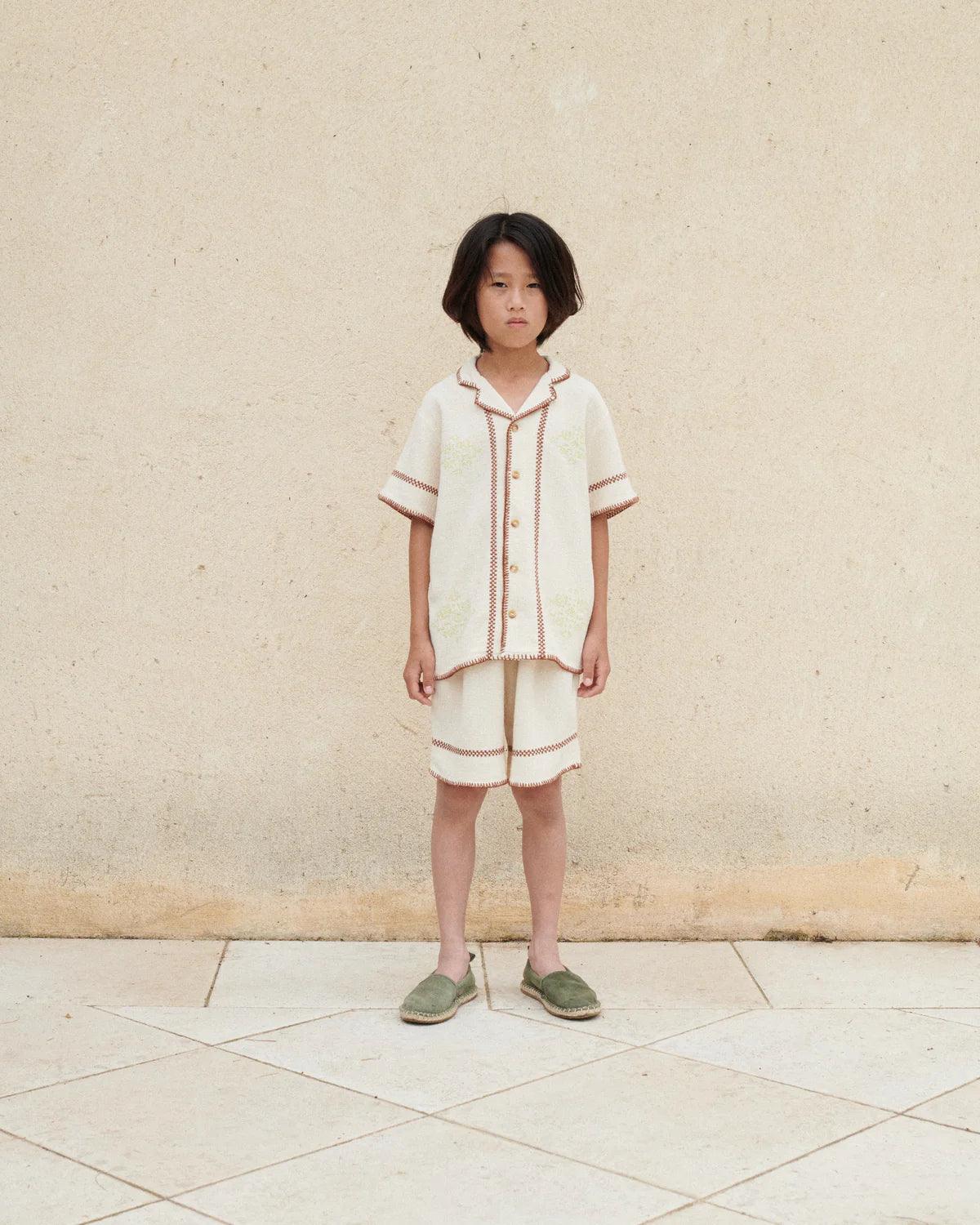 Urocza koszula Luka w stylu vintage, z niebarwionej, naturalnej bawełny organicznej. Ma klasyczny kołnierzyk, haftowane detale i guziki z przodu. Lekka koszula wierzchnia na wiosnę/lato, którą koniecznie musisz mieć. Idealne dopasowanie do spodenek Luka.