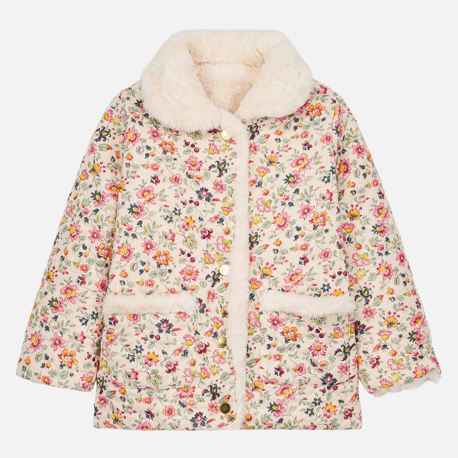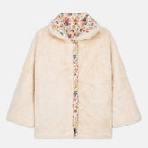 Dwustronna kurtka z jedną stroną z pikowanej podwójnej gazy bawełnianej w kwiaty, a drugą ze sztucznego futra ultra-miękkiego w dotyku.