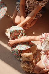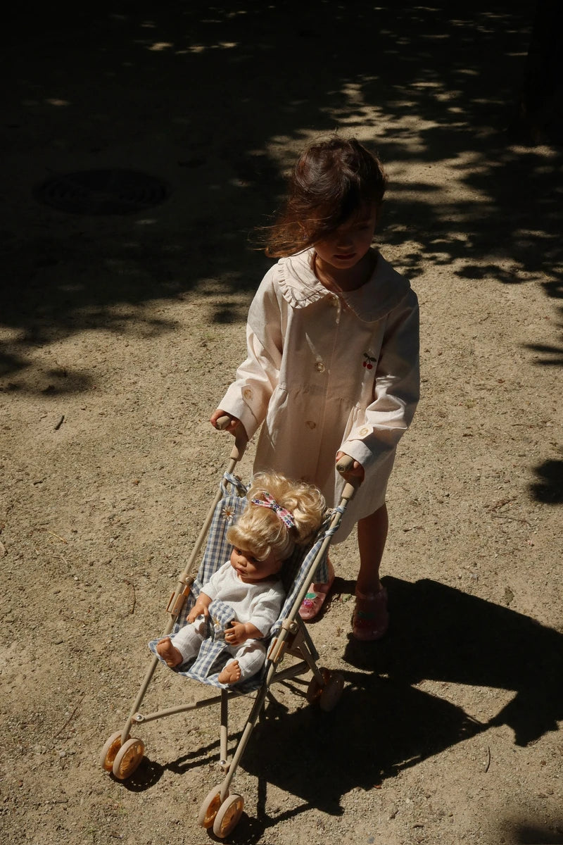 Lalka z kucykiem i serduszkowym strojem pointelle. Materiały: Lalka: winyl. Włosy: PP. Skorupa ciała: bawełna. Wypełnienie: poliester. Smoczek: PP. Tkanina: bawełna.