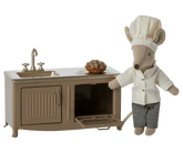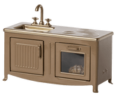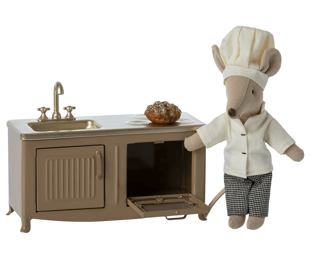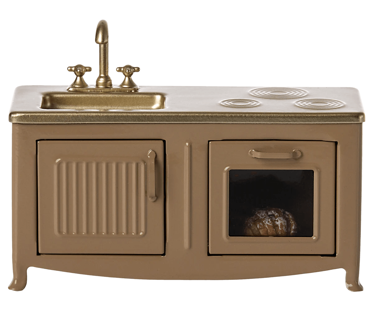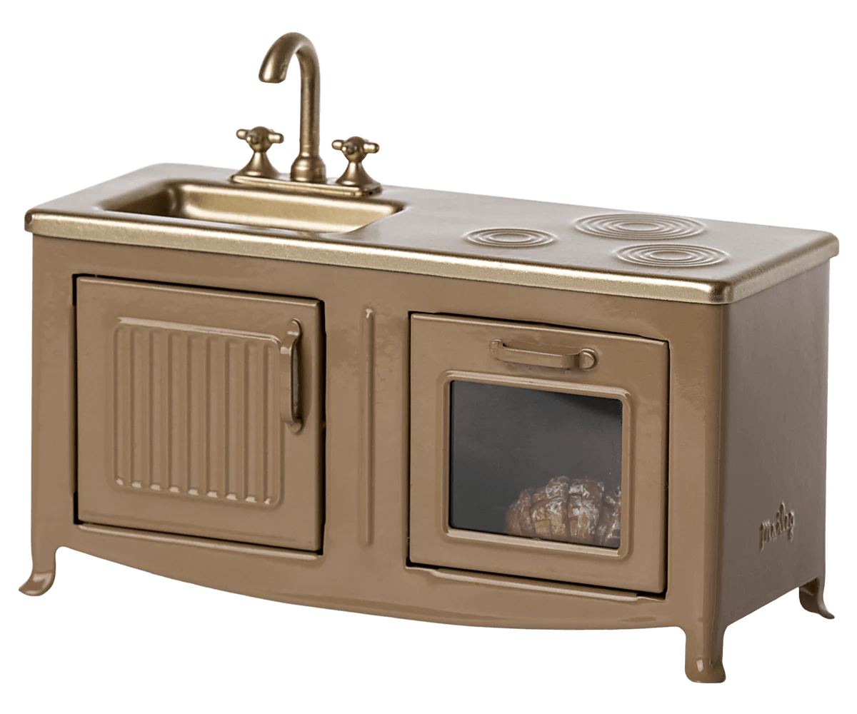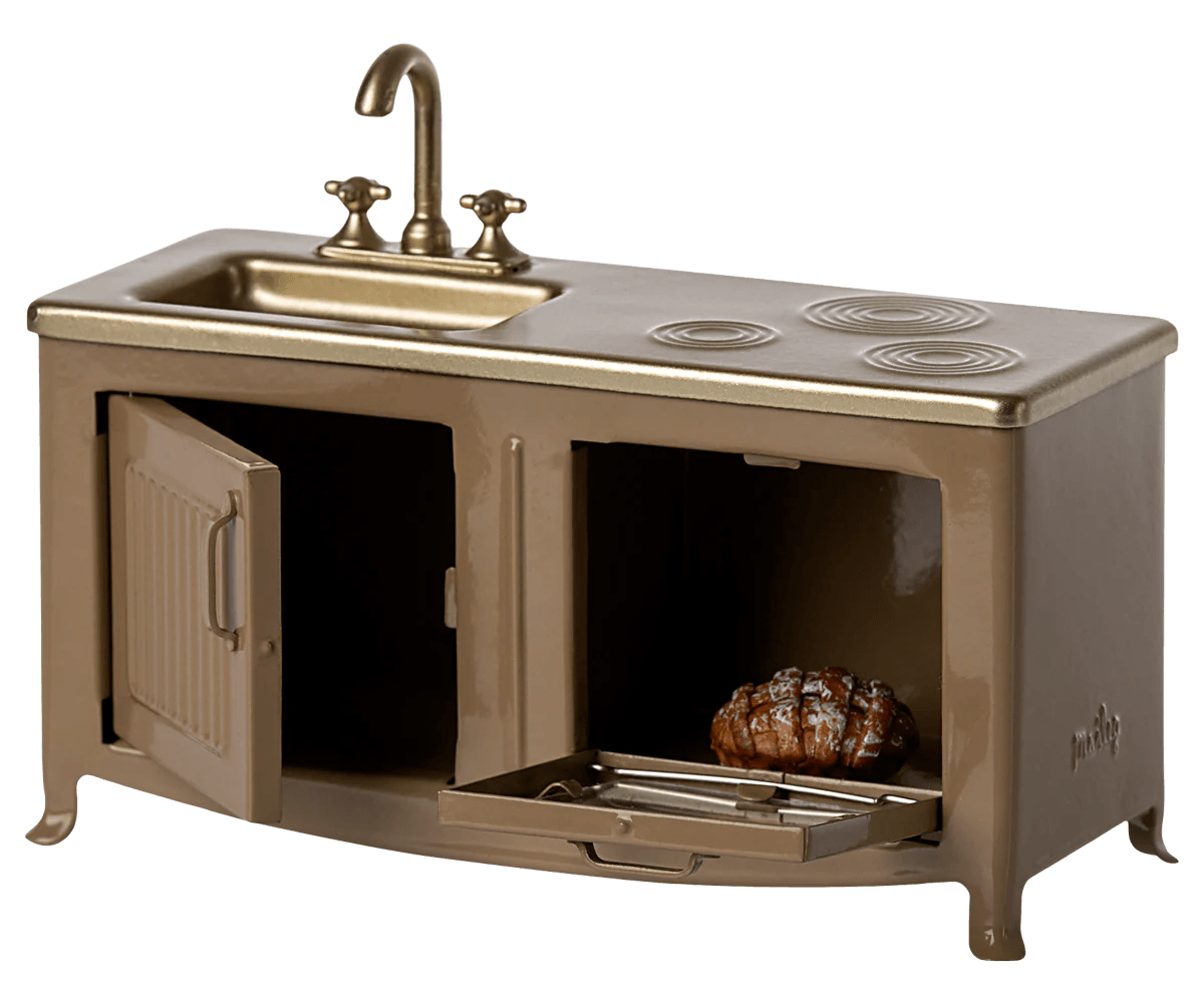 Sercem każdego domu jest kuchnia. Ta metalowa kuchnia ma piękny odcień i wiele zabawnych detali, takich jak drzwi szafki, zlew i piekarnik ze świeżo upieczonym ciastem. Ma idealny rozmiar dla rodziny myszy.
