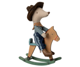 Fantastyczny zestaw na wiele godzin zabawy. Myszka kowbojska ubrana w dżinsy, szalik i kowbojski kapelusz jadąca na koniu na biegunach. Zwróć uwagę na mały otwór na ogon, który jest wykonany na koniu.