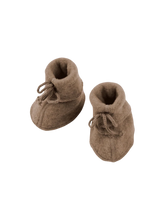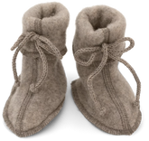 Buciki niemowlęce wykonane w 100% z organicznej, dziewiczej wełny zapewniają ciepło i jednocześnie optymalne warunki dla skóry dziecka. Każdy rodzic doskonale o tym wie: maluchy często zrzucają skarpetki lub buciki, gdy leżą w wózku lub łóżeczku. Wystarczy zawiązać je wstążką, aby buciki pozostały na swoim miejscu.
