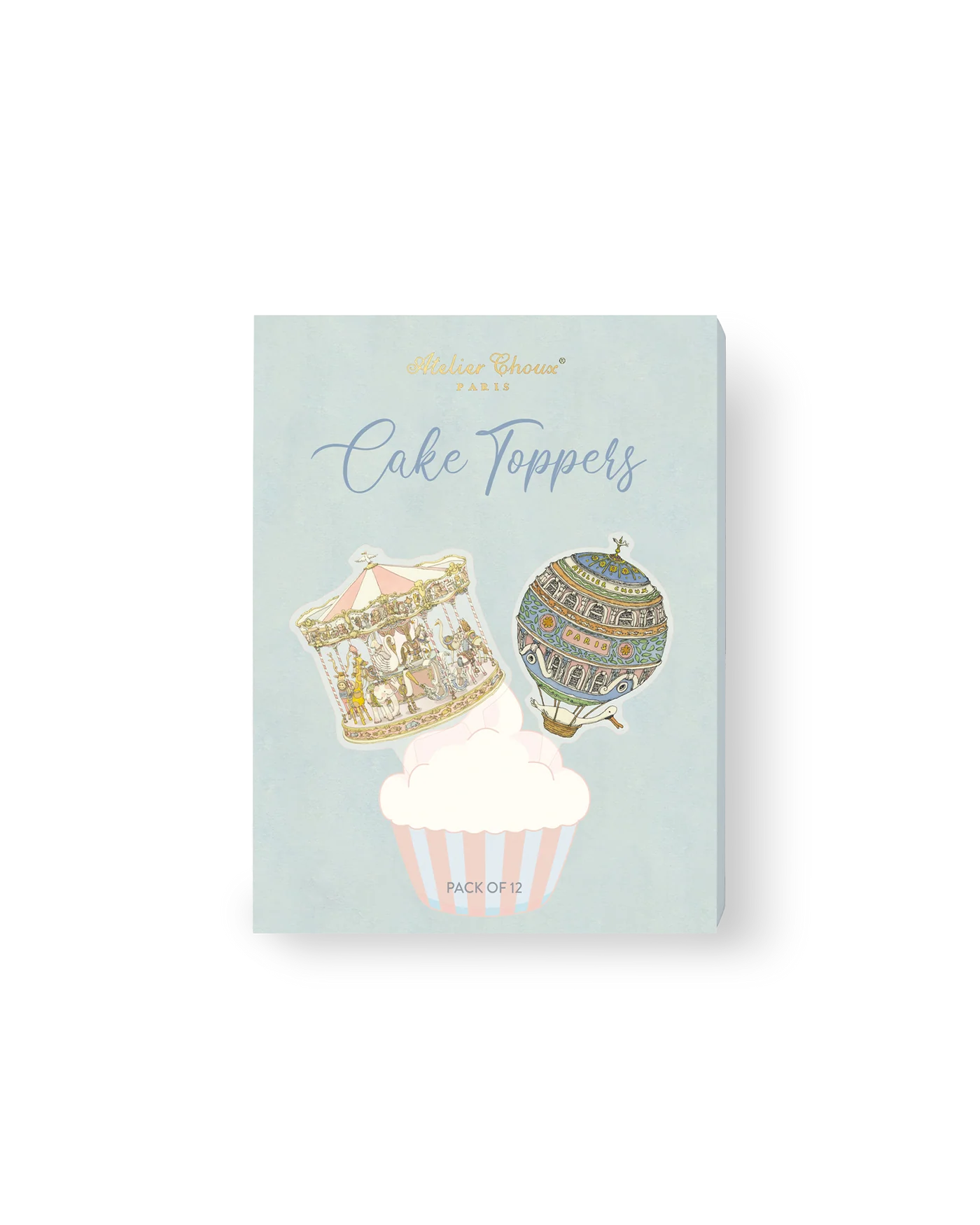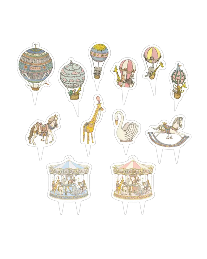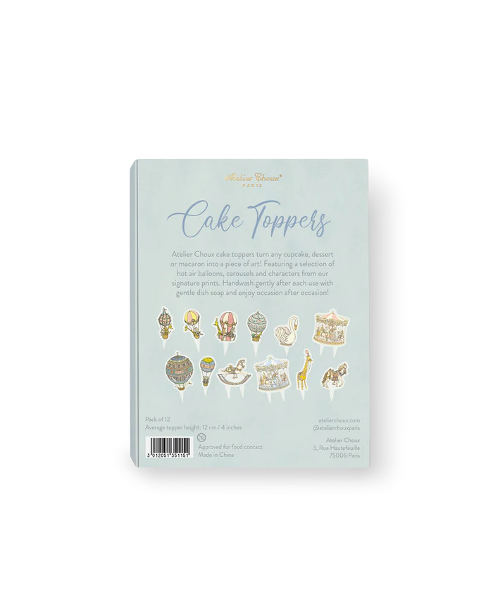 Atelier Choux Mini Cake Toppers zamieniają każdy deser — ciasto, wieżę z makaroników lub ciastko — w świąteczne dzieło sztuki. Ten zestaw zawiera 12 wielokrotnego użytku ozdób z naszymi najbardziej charakterystycznymi ilustracjami: balonami na ogrzane powietrze, karuzelami i paryskimi scenami.