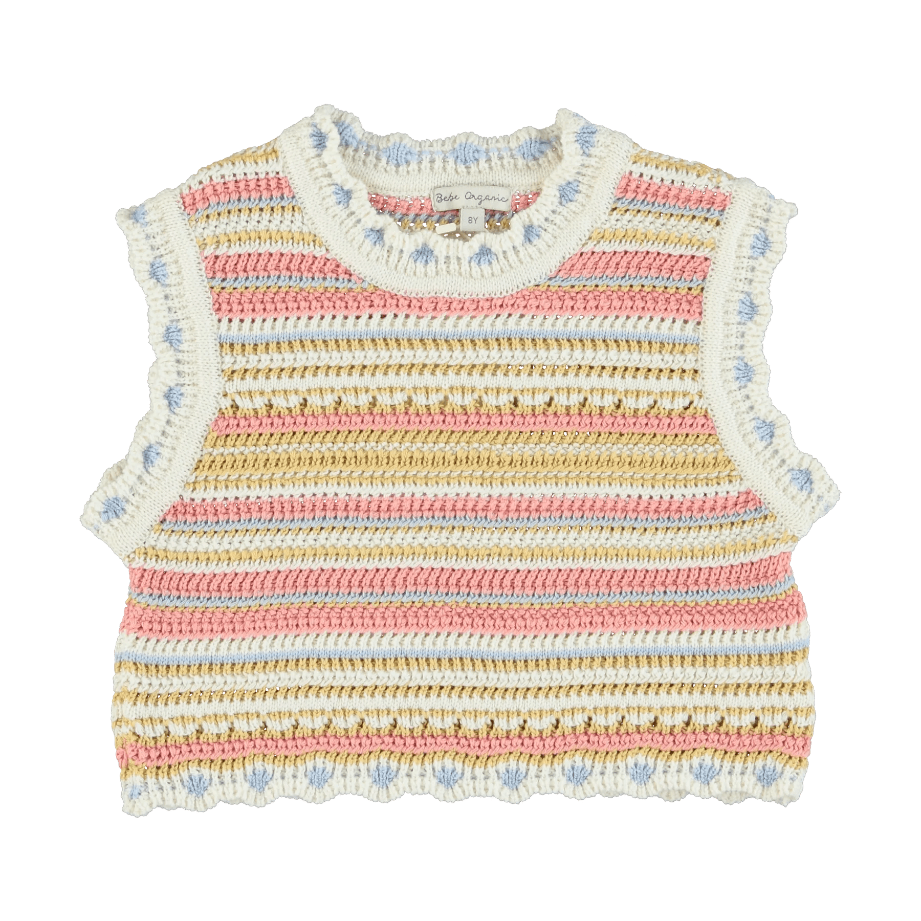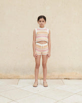 Dzianina naszych marzeń! Top Paloma wykonany na szydełku z wielobarwnej przędzy z bawełny organicznej to będzie ulubiony styl na nadchodzące letnie dni. Idealnie pasuje do spodenek Paloma.