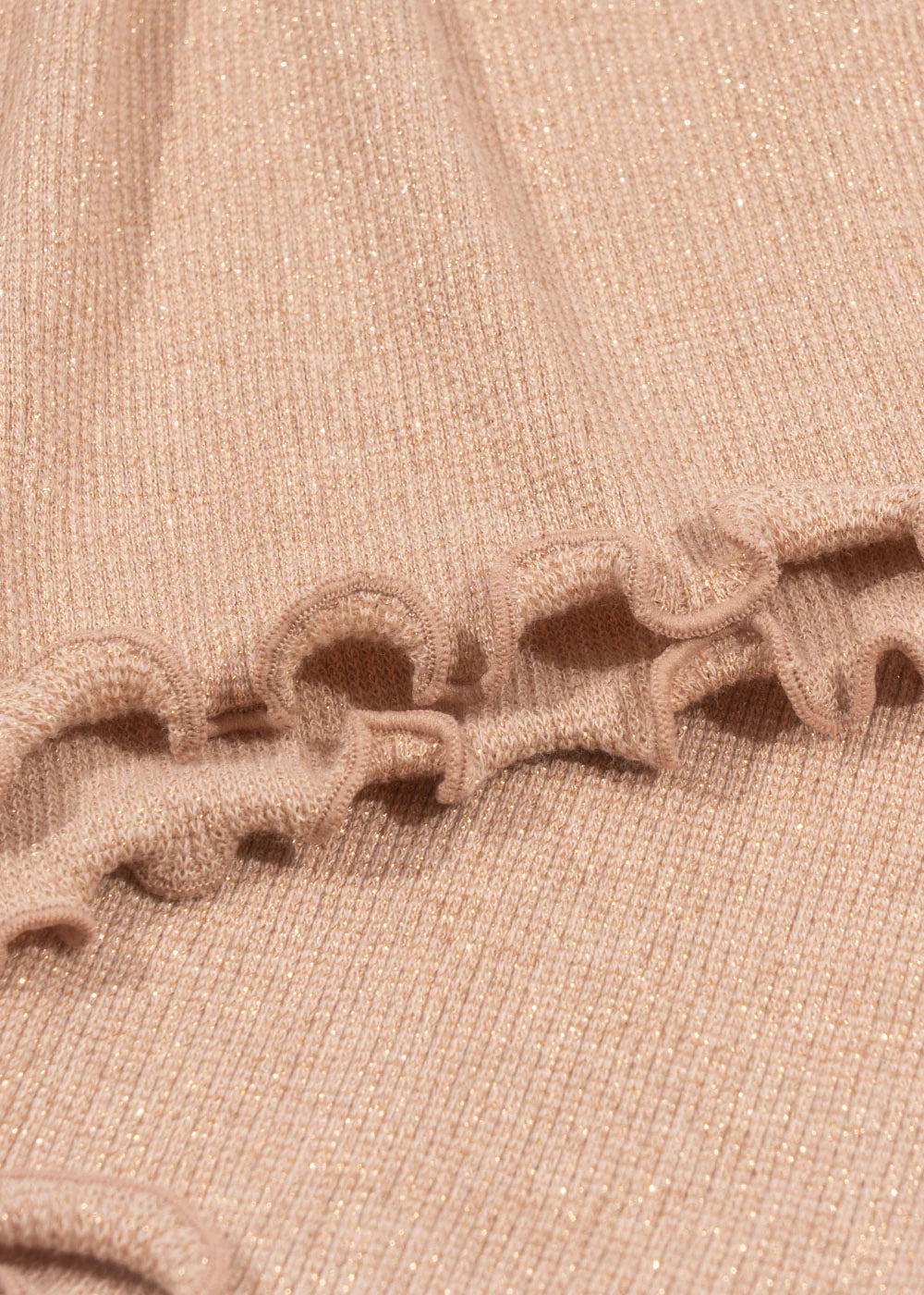 Dwuczęściowy zestaw z bluzką z krótkim rękawem i spodenkami wykonany z elastycznej, połyskującej tkaniny.