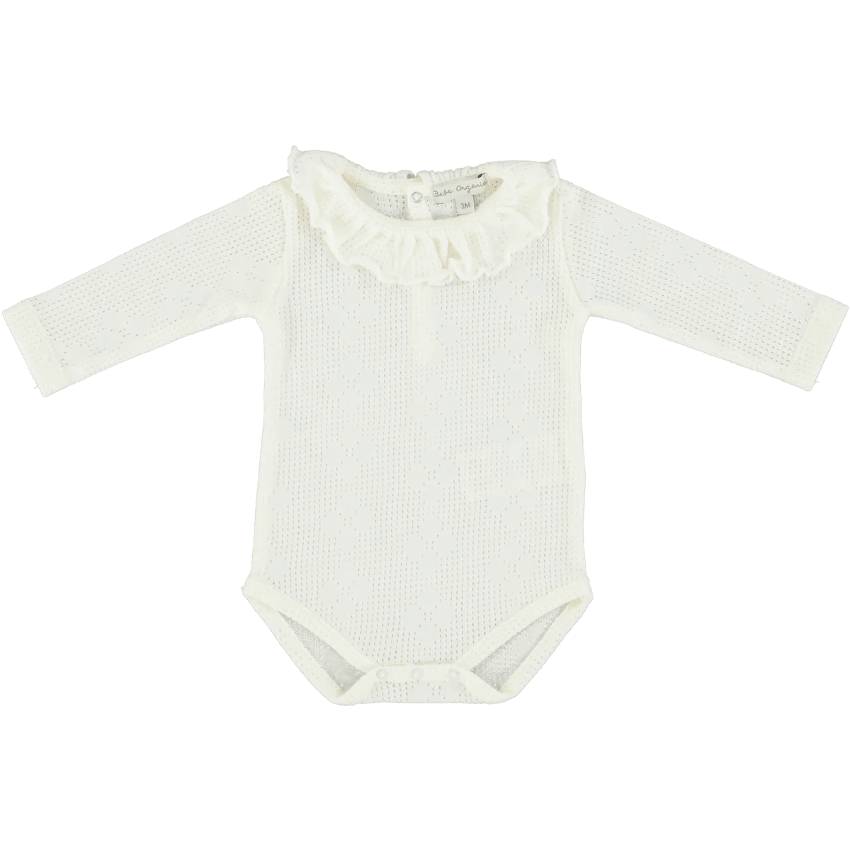 To body to idealny produkt dla noworodków. Niezwykle miękkie, wykonane z bawełny organicznej, ma marszczony kołnierz, długie rękawy, zatrzaski z tyłu i w kroku. Wykonane z najdelikatniejszej bawełny organicznej, żakardowej pointelle w kwiaty.