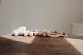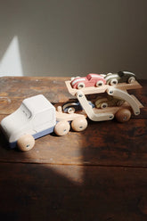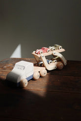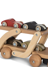 Drewniana ciężarówka, która przewozi 4 samochody wyścigowe.