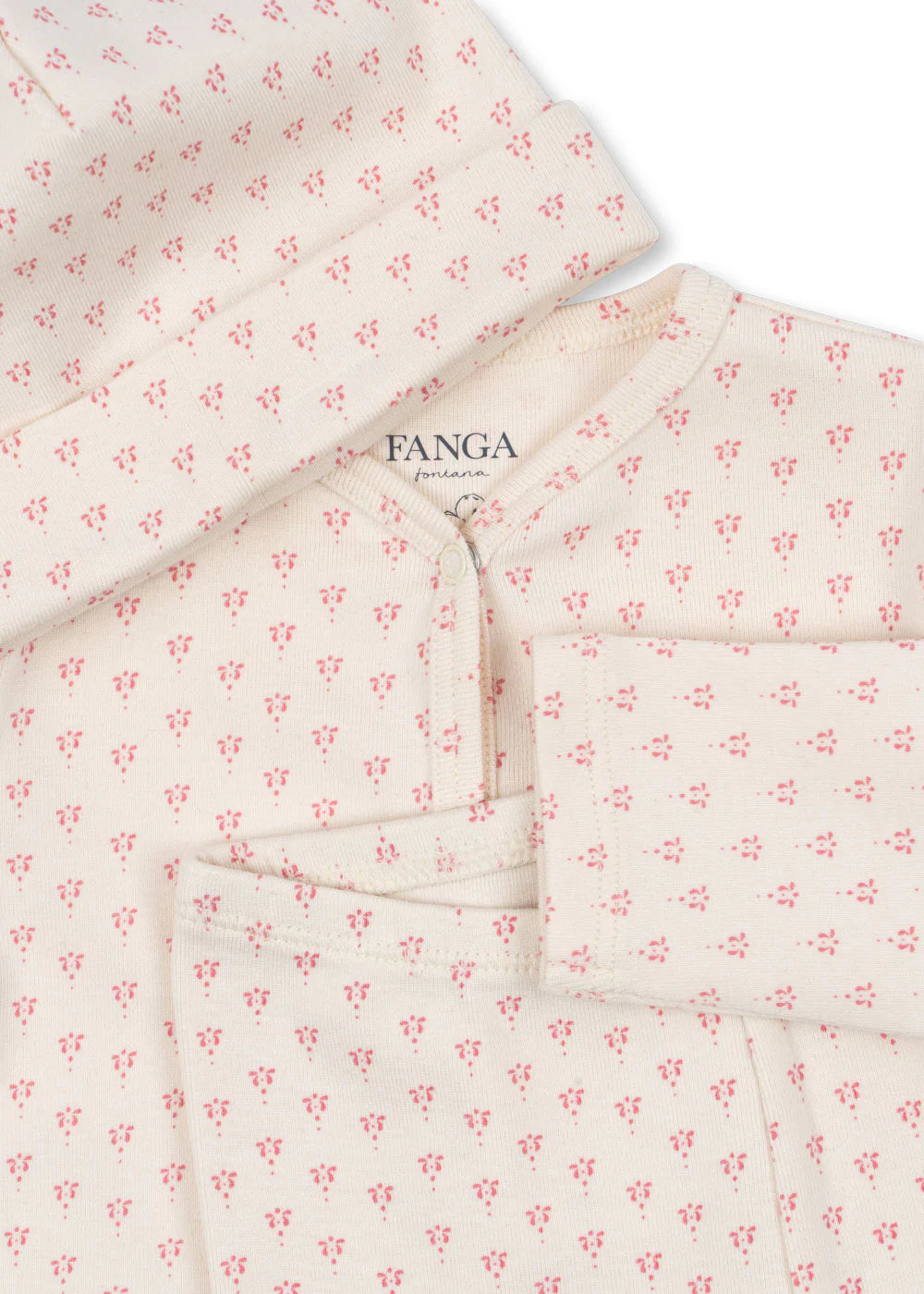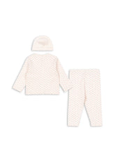 Miękki komplet dla noworodka, który zawiera spodenki z organicznej bawełny, miękką bluzeczkę rozpinaną z przodu na zatrzaski oraz małą czapeczkę, która ogrzeje malucha.