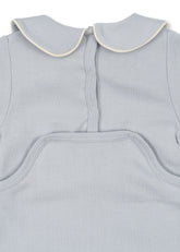 Przemyślany zestaw upominkowy zawierający: bawełniany kombinezon z nóżkami i misia przytulankę.
